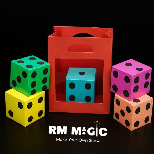 Show an everyday brown paper bag folded FLAT. Now Magician Open it and reaches inside and removes A Large Jumbo Size Dic from Bag. Once again he shows the bag empty then reaches in and this time removes Similar Dic of another color. Magicians Repeat this for Five Times and his table get filled with Jumbo Colored Five dic.